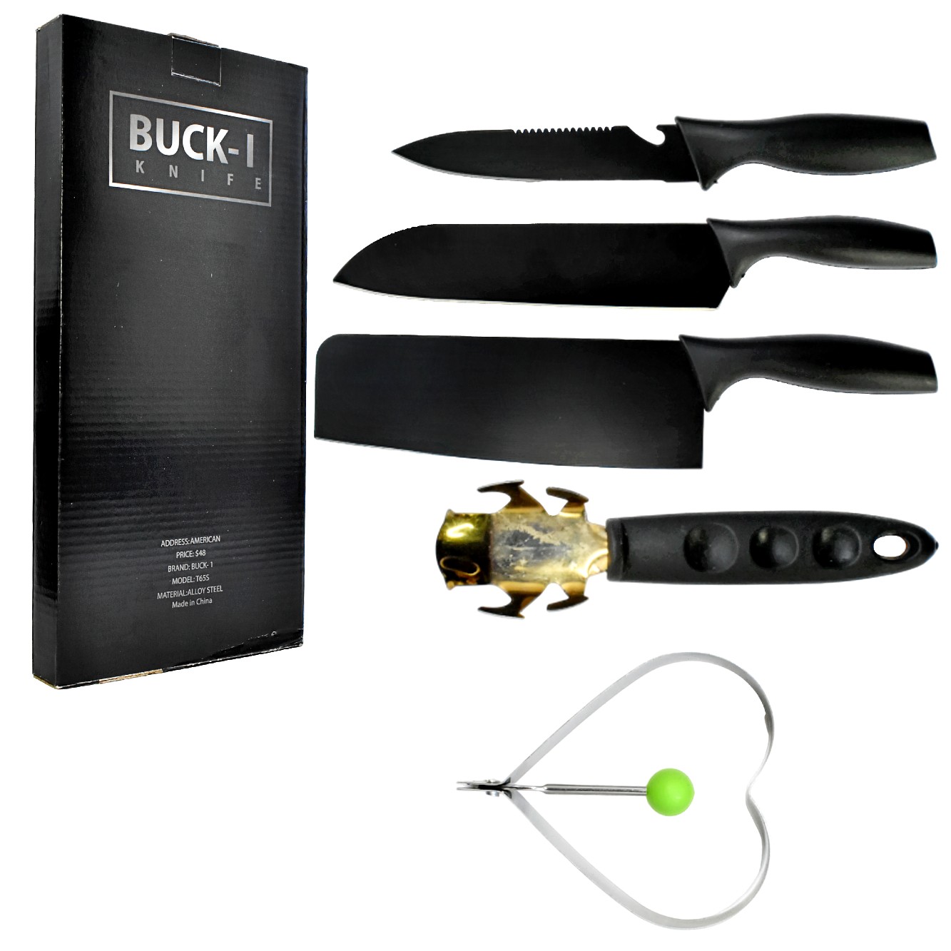 Eleva tus habilidades culinarias con este set de cuchillos de diseño moderno y alta precisión. Cada pieza está fabricada con acero de excelente calidad y cuenta con un recubrimiento negro antiadherente que facilita el corte y la limpieza. El juego incluye un cuchillo de chef, un cuchillo para pan, un cuchillo multiusos, un pelador ergonómico y un molde especial, todos presentados en una elegante caja protectora. Sus mangos ergonómicos proporcionan un agarre seguro y cómodo, convirtiéndolo en el aliado perfecto para cualquier tipo de preparación en la cocina.
